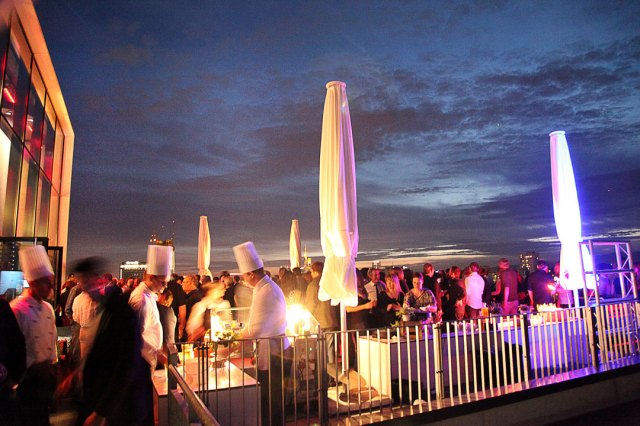 Die Sonne ist nun hinter den Wolkenkratzern verschwunden. Zum Nachtisch gibt es Apfeltiramisu, oder American-Brownies mit kandiertem Rhabarber. Außerdem Marcons, das neue Trendgebäck, klärt mich einer der Kellner auf. Kleine, luftige Kekse in Pastellfarben auf Schaschlickspießen.